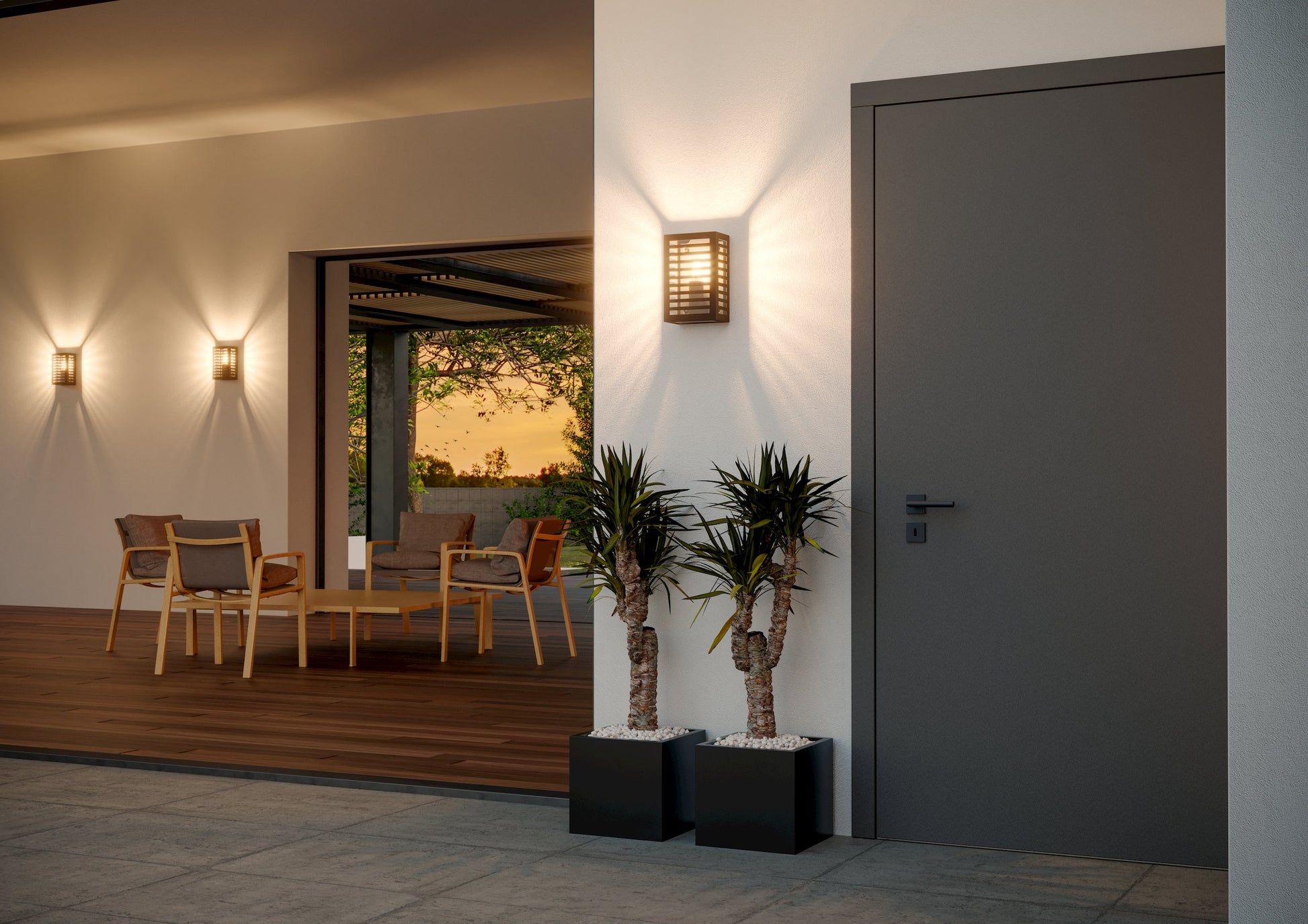 The ALAMONTE 3 external wall light comprises clear glass panels mounted on a cuboid metal frame. The stripe design adds a sophisticated finishing touch to the light's distinctive appearance while generating a relaxing atmosphere and indirect light. This external light is appropriate for outdoor usage and merges beautifully into contemporary outdoor spaces thanks to its IP44 protection against spray water.