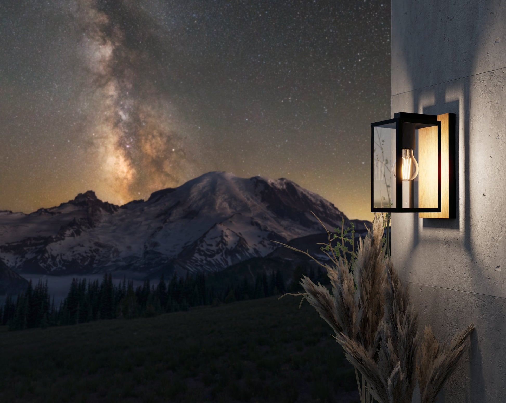 The BUDRONE outdoor wall light has a black metal frame and clear glass panels that let you see the lightbulb inside. The item has a rectangular plate at the back, which is coated with a finish that looks like wood. This finishRephrase is resistant to the weather. The wall light can be flipped to shine the lightbulb upwards or downwards depending on how it is installed. This product is great for using outside because it has IP44 protection against water spray. It's perfect for making outdoor areas look modern. The lightbulb in the picture is not part of the package. The product has a lamp holder called E27, and it needs a lightbulb called E27.