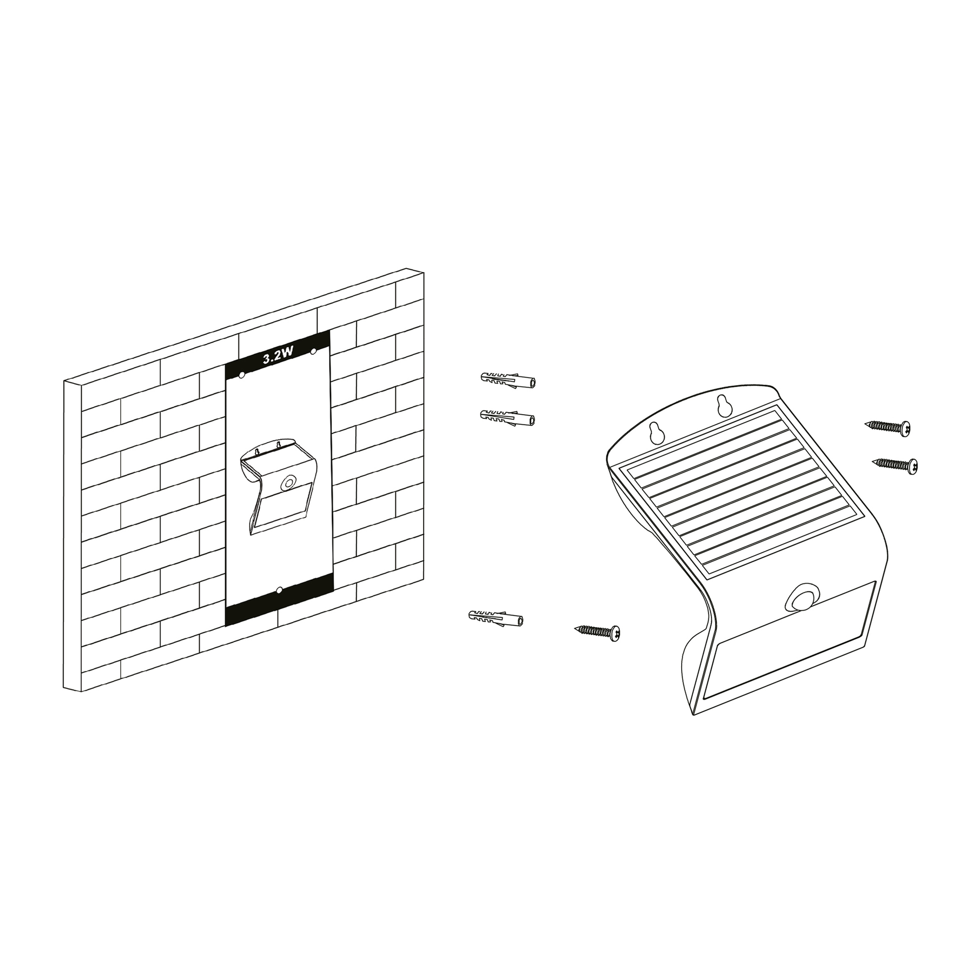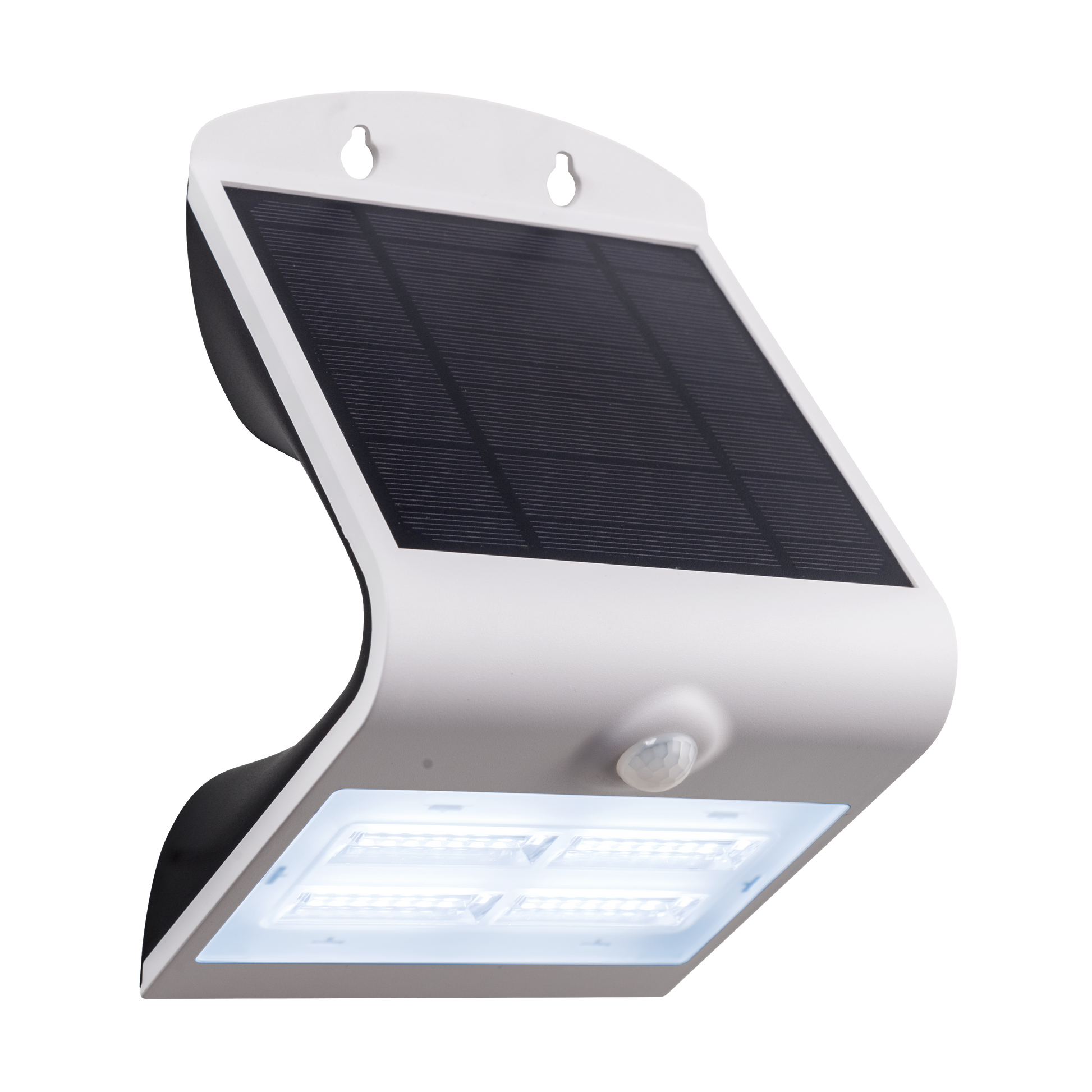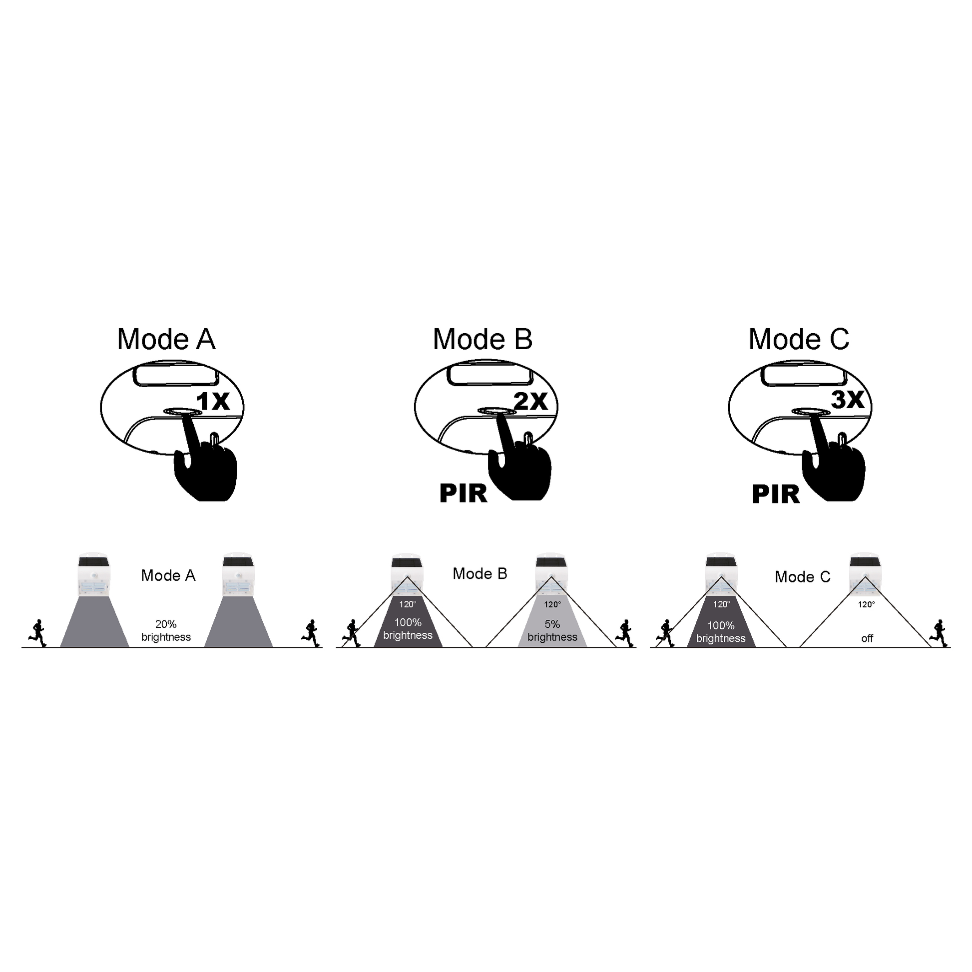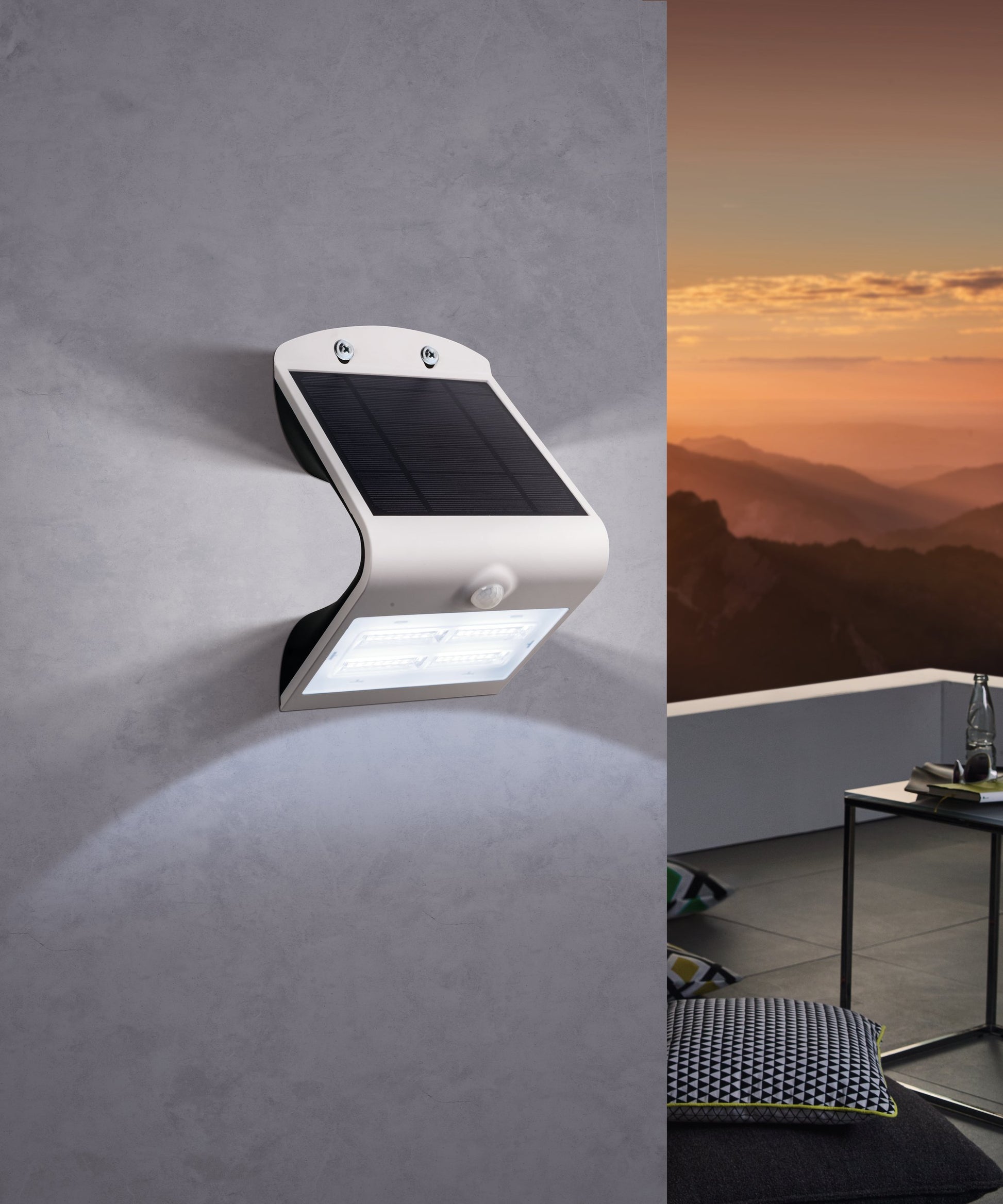 The LAMOZZO outdoor LED wall light is made of white plastic and has a solar panel and a battery built inside. The product has a soft, warm light that shines on the wall in a roundabout way, and a white light at the front. This text means that there is a sensor in something that can detect if it is daytime or nighttime. You have the option to choose from three different options or settings. In mode A, the light turns on by itself at a low brightness of 20% when it starts getting dark and turns off on its own when it becomes daytime. In mode B, when something moves, the light turns on really bright without us having to do anything. The light stays on for 20 seconds. If there is still movement, it becomes dim and gets 5% brighter. In mode C, the light turns on by itself at full brightness when it senses movement. The light stays on for 30 seconds and then turns off, even if there is still movement. The motion detector helps light up places where it's hard to see and scares away people who aren't supposed to be there. The built-in sensor measures how bright the surroundings are to make sure the light turns on only when necessary. This product is designed to be used outside because it is protected against dust and spray water. It also looks great in modern outdoor spaces.