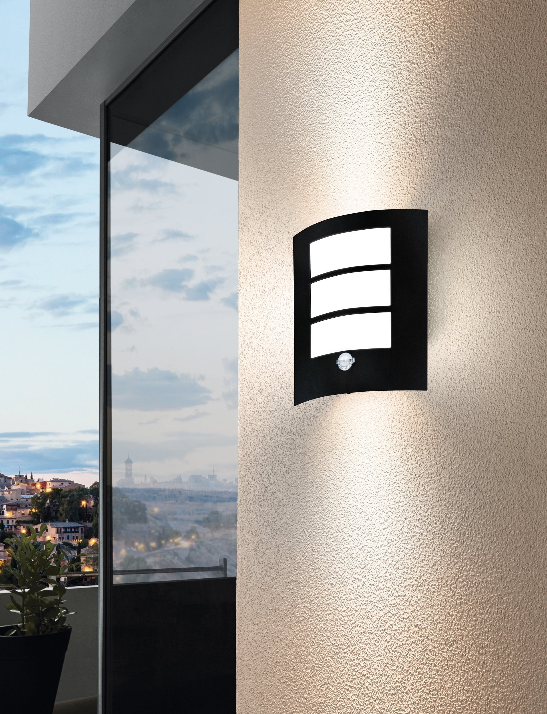 The CITY outside wall light has three white glossy plastic light diffusers and a curving body constructed of black zinc-plated metal. The wall light has a motion sensor built in that activates automatically, illuminating low visibility regions and discouraging unwelcome guests. To guarantee that the light only turns on when necessary, the integrated twilight sensor measures the ambient light level. The outside light is appropriate for outdoor use because it has IP44 protection against water spray. The traditional design blends into a variety of outdoor areas, whether at the entry or on the terrace, and offers safe, dependable, and glare-free lighting. One E27 lightbulb, which is not included with the device, is needed.