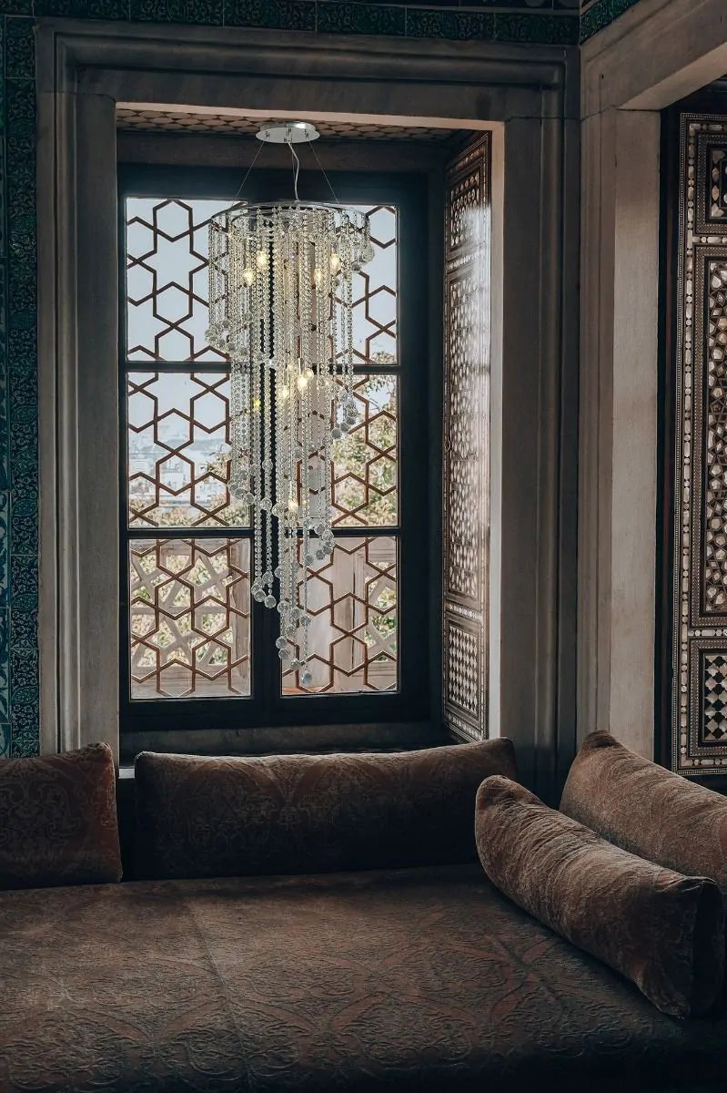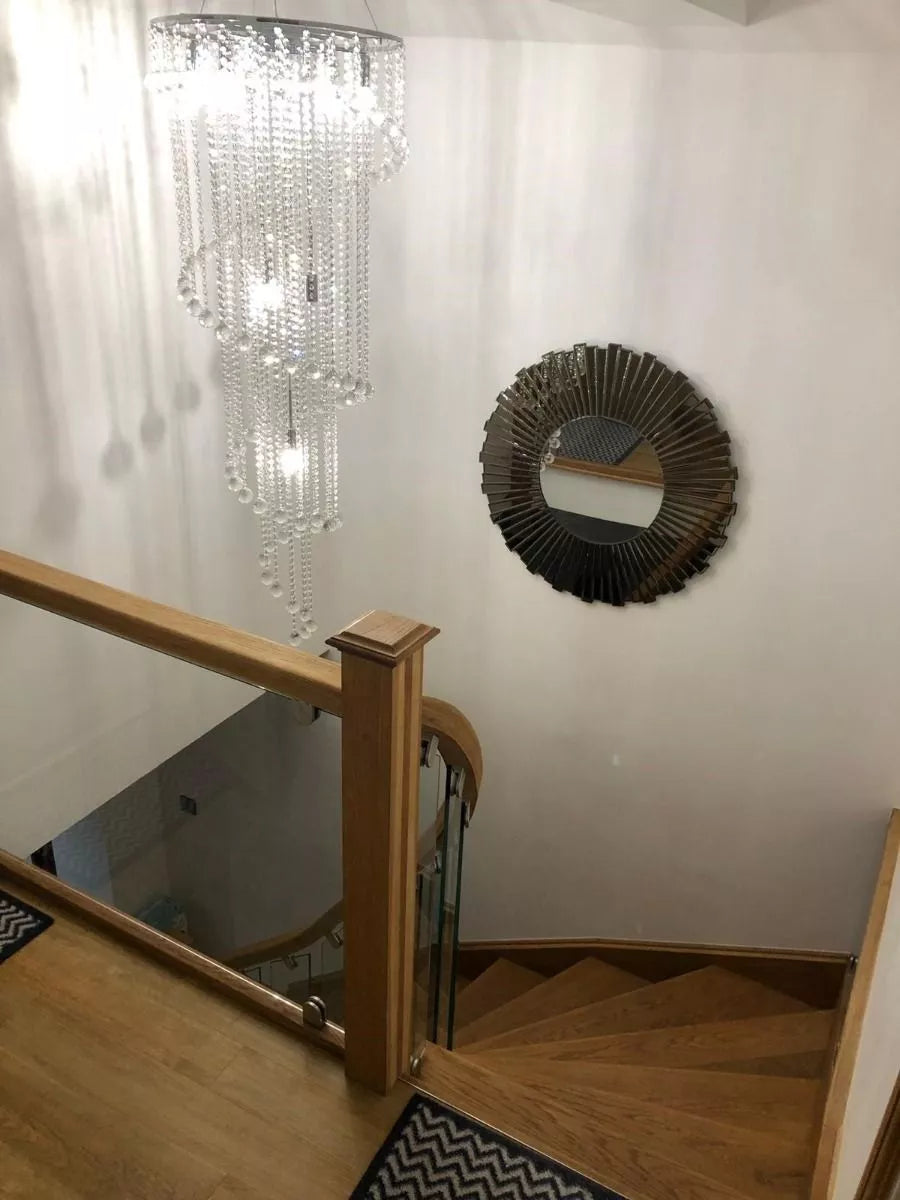 to its modern feel with the astonishing precious stones including to its a la mode tasteful. The plate holds strings of clear Asfour precious stones at diverse lengths making its wonderful winding plan. The lights are scattered equitably all through the fitting which permits the light to sparkle through and reflect on the gems making a entrancing light show. The tallness of the pendant makes it appropriate for stairwells and passages.