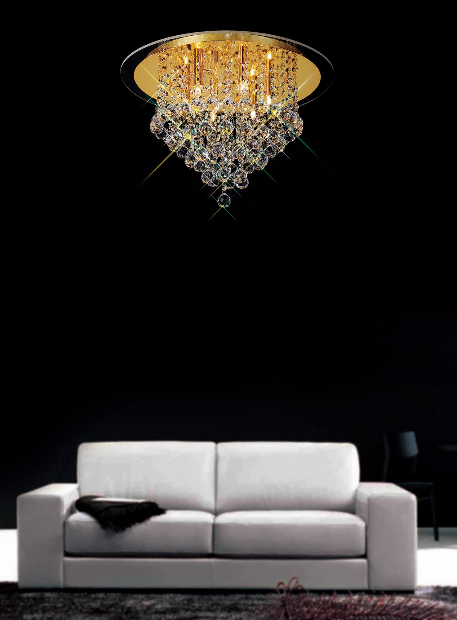 The Atla collection has a ceiling light in French Gold with four lights. This thing shows a round plate on the ceiling. RephraseOn the plate, there are thin strings made of Asfour crystals. These strings are placed at different heights to make a beautiful shape that gets smaller at the top. At the ends of the strands, there are big crystal balls. When these balls are lit, they create a lovely display of different colors that spread all over the room. This product combines both traditional and modern styles, making it suitable for many different styles of decorations. A flush fitting is great for rooms with shorter ceilings.