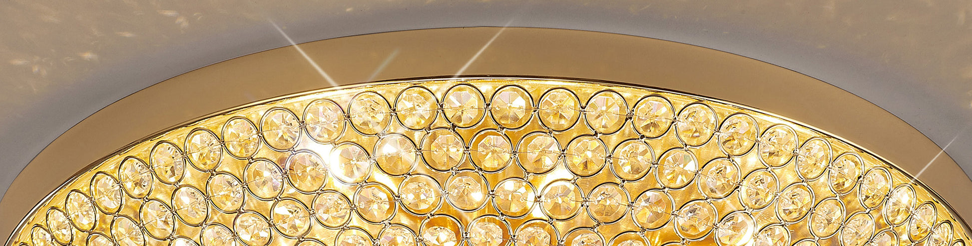 This Diyas ceiling light with 6 bulbs is a popular item in the collection. The modern design feels traditional with its semi-circular dome shape in French Gold. This item has lots of small, good-quality crystals and is great for homes with shorter ceilings. RephraseWhen there are a lot of crystals and they are illuminated, it creates a very impressive display of light and color. LED lamps and Halogen lamps are both good choices for this fitting if you want to save energy.