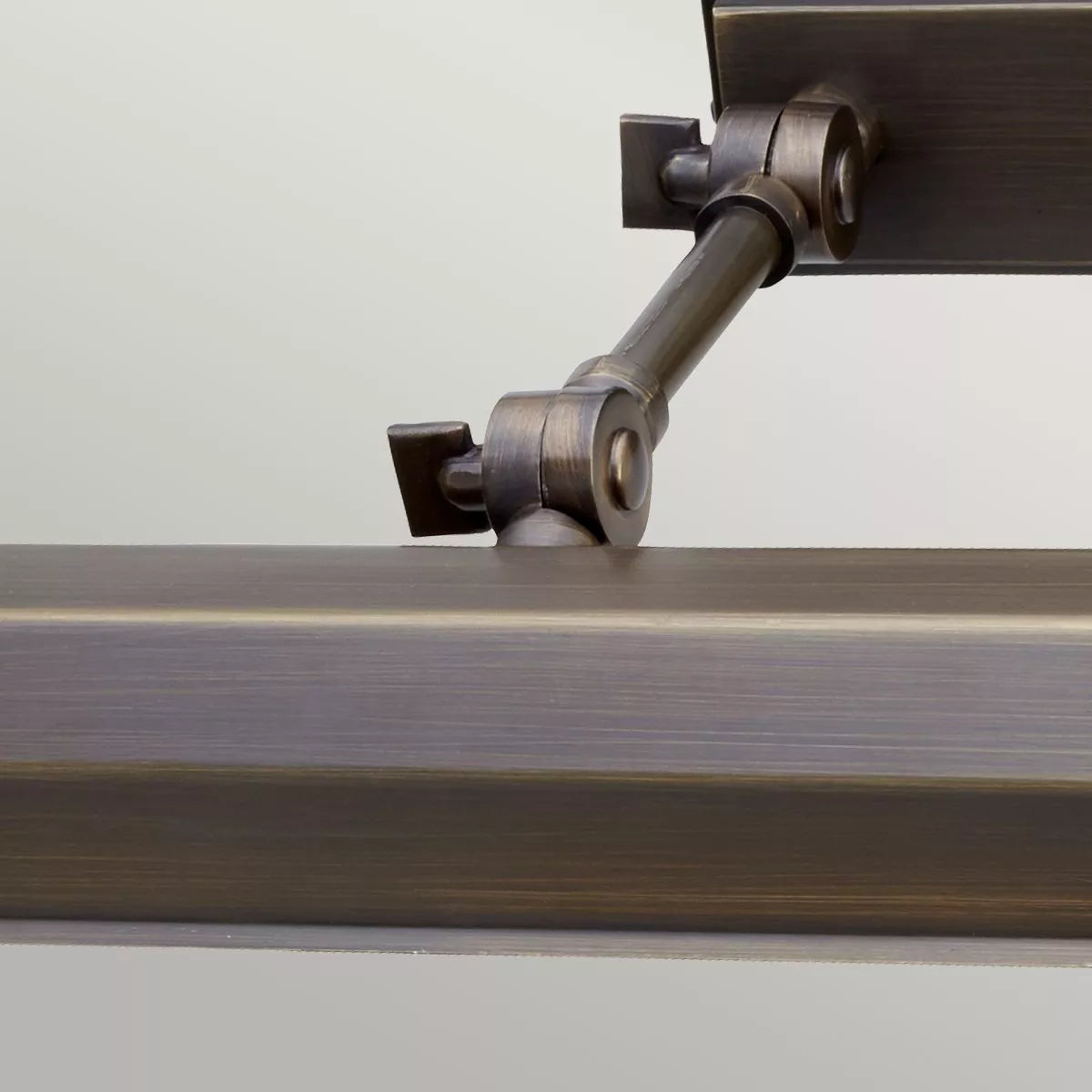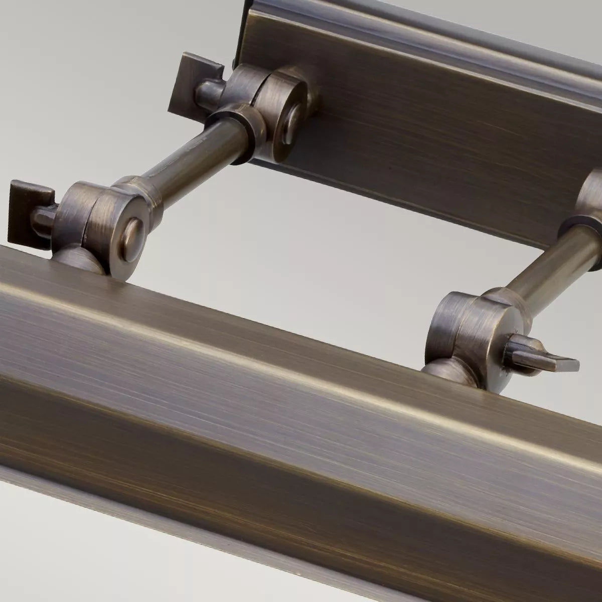 This picture shows a light from Elstead Lighting. It is part of a collection called Chawton. It has a rectangular wall plate and two arms that hold a prism with no bottom. The prism can hold four light bulbs. The arms have two knuckle joints each that let you change the direction and focus of the light. The picture light, which is colored dark bronze, is greatRephrase for lighting up art projects and family portraits in both modern and traditional settings, whether it's at home or in a business place.