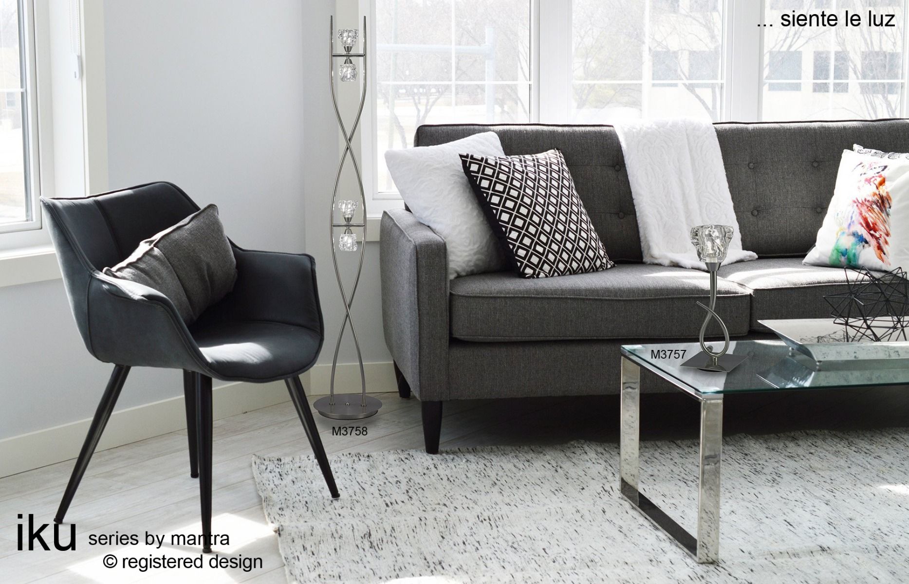This floor lamp from Mantra features a circular base plate with two curved metal stems entwined with two small rods in between and supports four glass shades. Each shade is sculptured and is designed to reflect the visual impact of ice glaciers and holds a single G9 lamp. Finished in polished chrome the floor lamp is ideal for modern and contemporary spaces. Suitable for dimming.