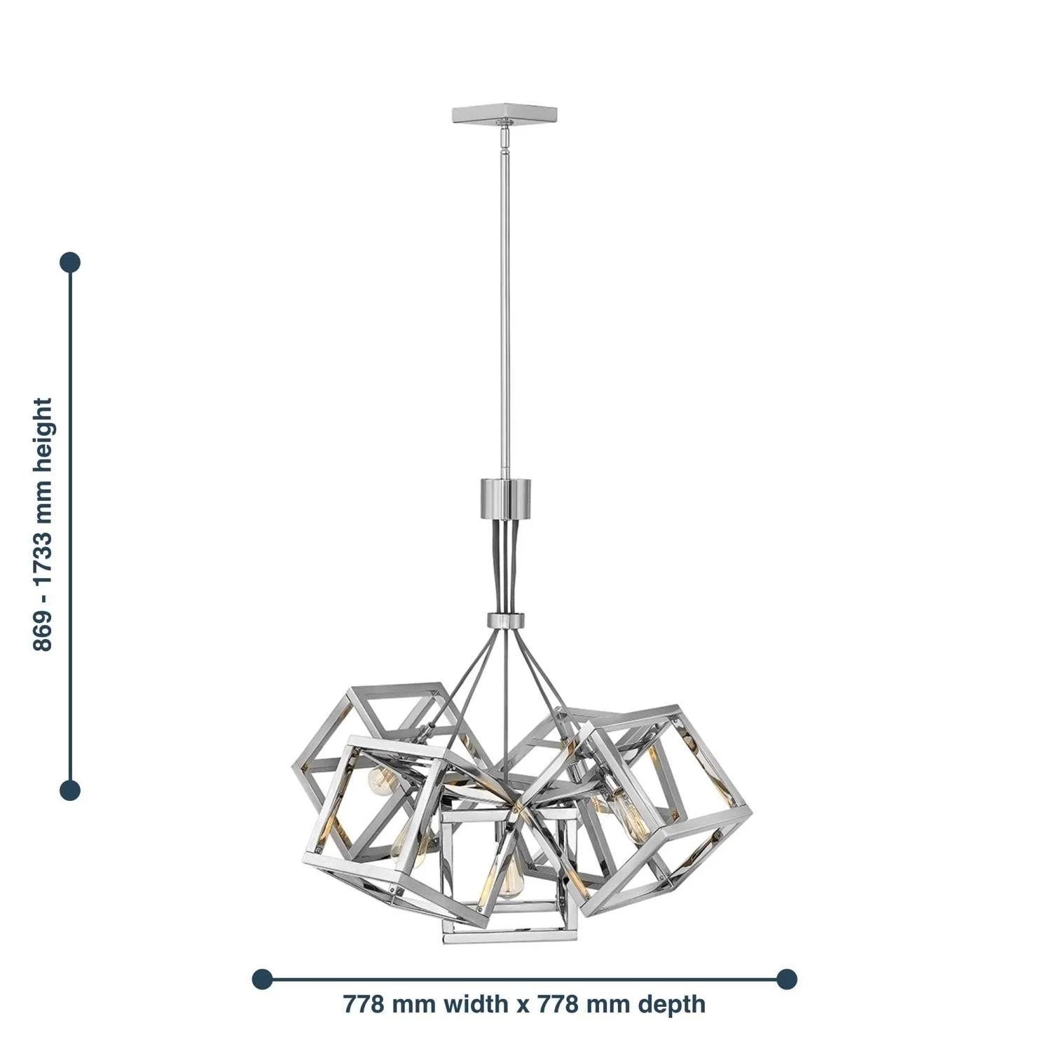 The Ensemble collection is a stylish and interesting way to brighten up modern rooms. This hanging light has five pretty square frames that are shiny and polished in nickel. Each frame has its own holder for a lamp. The pendants hang from a ceiling plate that matches them, and the way they are arranged creates a beautiful appearance.