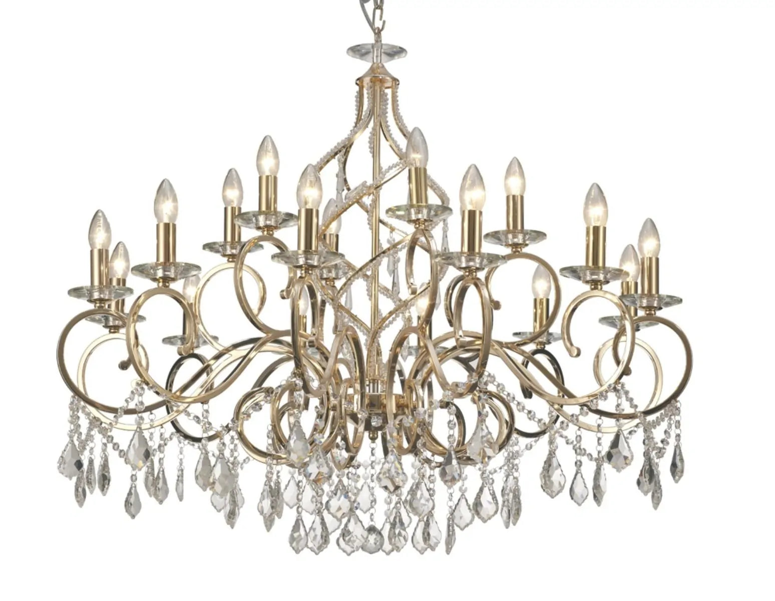 This amazing chandelier is portion of the surprising Torino extend from Diyas Lighting and shows a solid ceiling rose with a enhancing chain. The chain brings down the chandelier system and comprises of spiraled body and holds eighteen voluptuous arms at diverse statures making a multi-tier plan. Each arm holds a glass sconce and candle sleeve which holds a single E14 light. The outline is brightened with precious stone embellishments and reflects the light flawlessly and compliments the French Gold Wrap up. Stature movable amid establishment. If you don't mind note this fitting will require gathering.